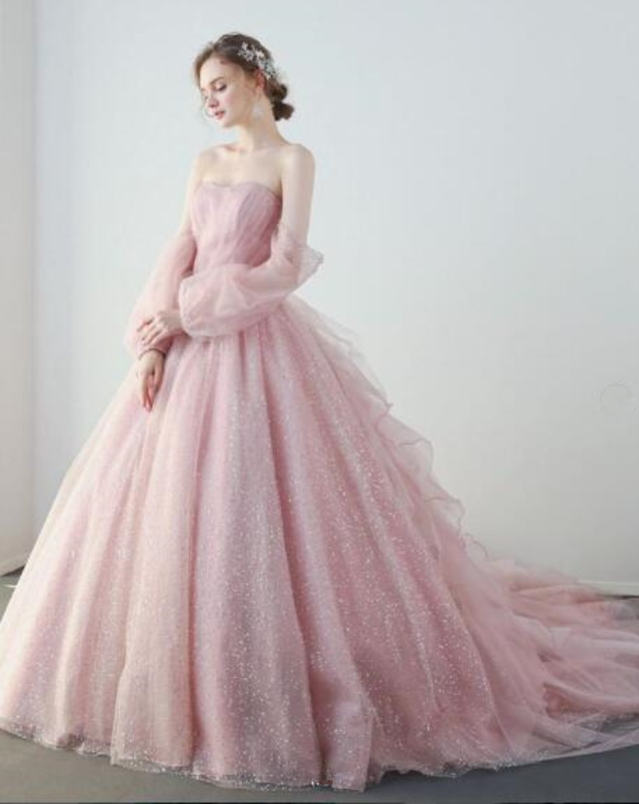キラキラチュール カラードレス 薄ピンク 前撮り 長袖 ベアトップ スリット 編み上げ 可愛い プリンセスライン 花嫁