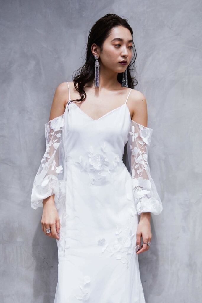 パーティードレス キャミソール 長袖 背中見せ Vネック レース 前撮り くるみボタン 拳式 トレーン 花嫁エレガント