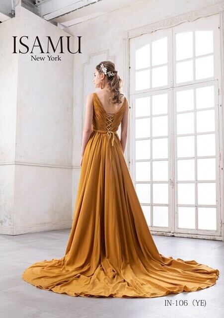 パーティードレス 鬱金色 スリット 編み上げ トレーン Vネック 背中見せ 発表会 ノースリーブ 前撮り