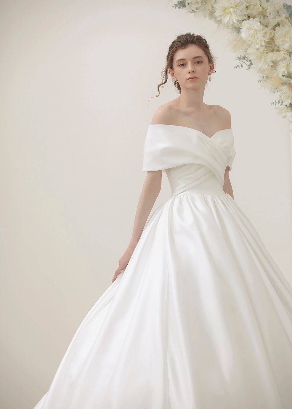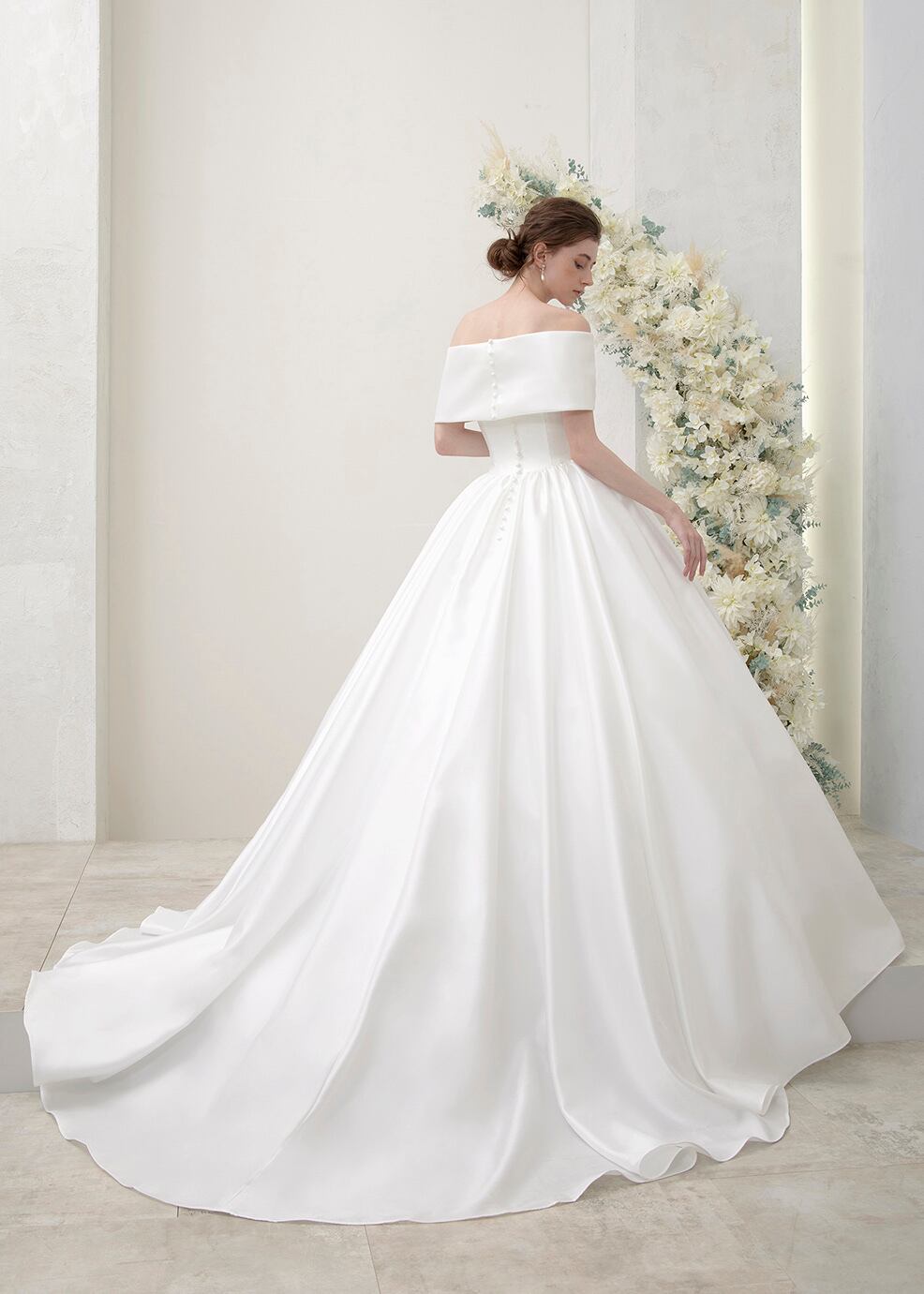ウエディングドレス オフホワイト オフショルダー トレーン 肩出し Aライン エレガント 花嫁 結婚式