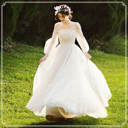 ロング 二の腕カバー 長袖 クルーネックウエディングドレス 可愛い 花嫁 拳式 二次会