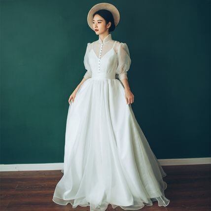 ヘップバーン風 クラシカル パフスリーブ ロングドレス パーティードレス パフスリーブ 前撮り くるみボタン