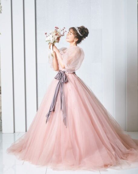 エレガント チュールスカート 妊婦 可愛い 花嫁 前撮り お呼ばれ カラードレス パフスリーブ ピンク フレアスカート