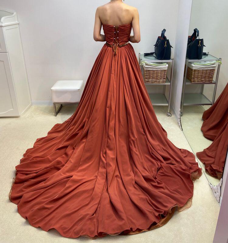 パーティードレス 可愛い テラコッタ色 前撮り 演奏会 編み上げ Aライン プリンセスライン ベアトップ