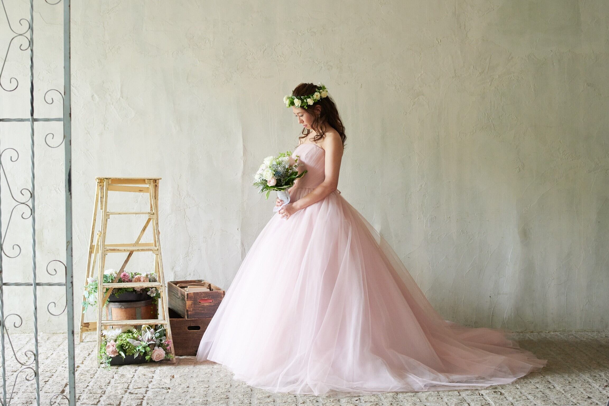 カラードレス ベアトップ /結婚式/披露宴 編み上げ 薄桃色 花嫁 プリンセスライン 可愛い