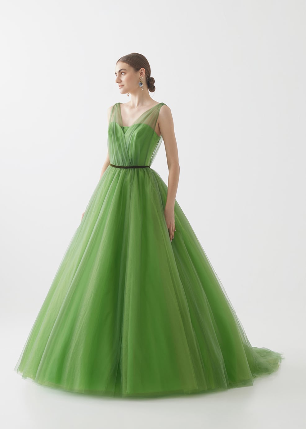 カラードレス Vネック ベルト エレガント グリーン 花嫁 プリンセスライン 可愛い 結婚式/披露宴 ノースリーブ 編み上げ
