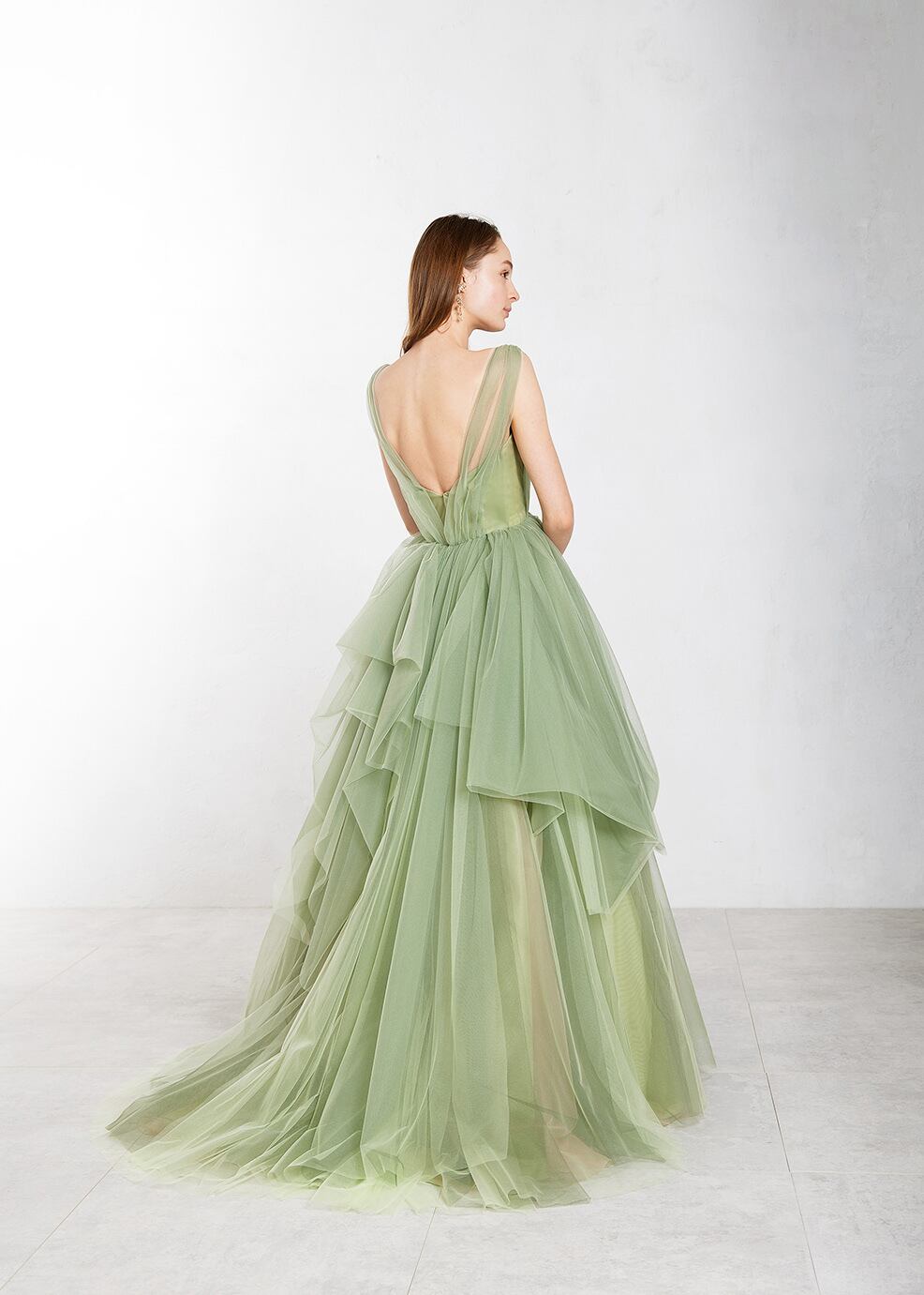 カラードレス Vネック エレガント 花嫁 可愛い 結婚式/披露宴 編み上げ グリーン 背中見せ