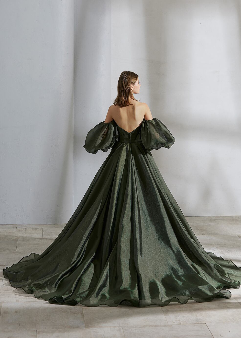深めな緑 カラードレス ベアトップ エレガント パフスリーブ 花嫁 可愛い 結婚式/披露宴 取り外し袖 背中見せ