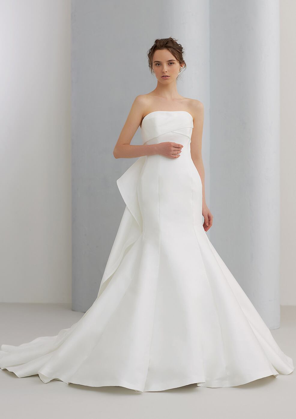 優しい パーティードレス ベアトップ マーメイドライン 花嫁 オフホワイト トレーン 二次会