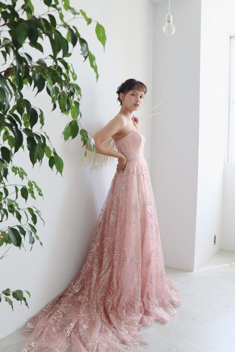パーティードレス ピンク ベアトップ 花嫁 二次会 拳式 可愛い 編み上げ キラキラ カラードレス