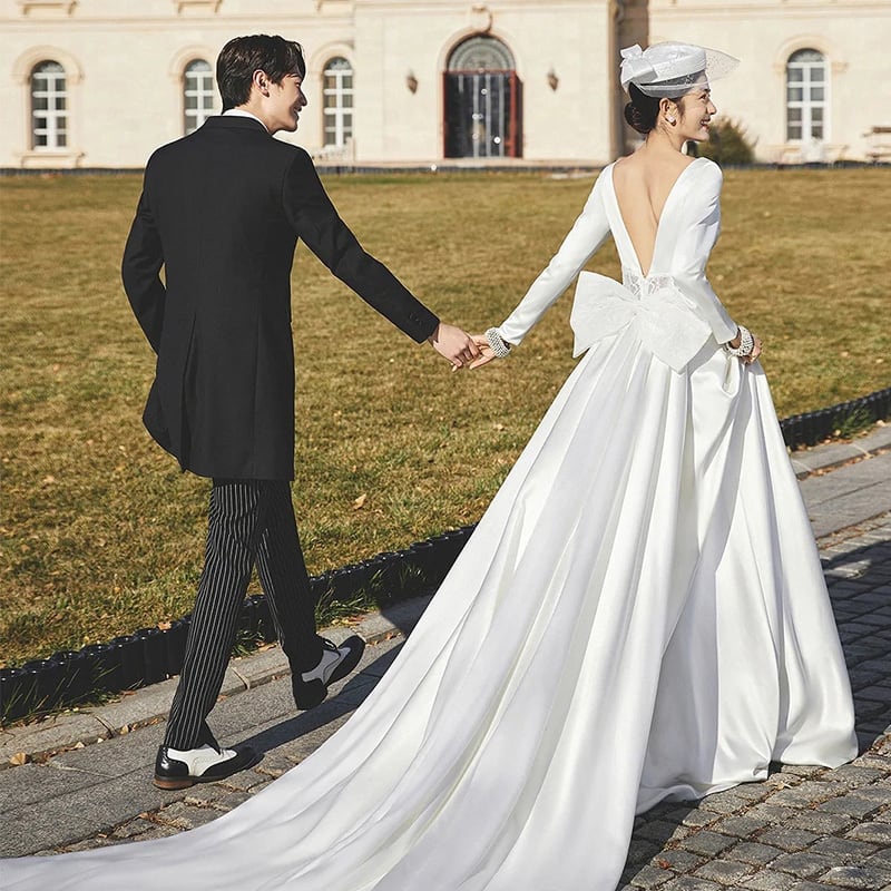 フランス風 長袖 リボン 背中見せ トレーン オフホワイト 花嫁 拳式 結婚式 ウエディングドレス