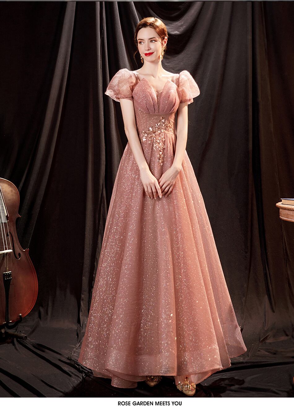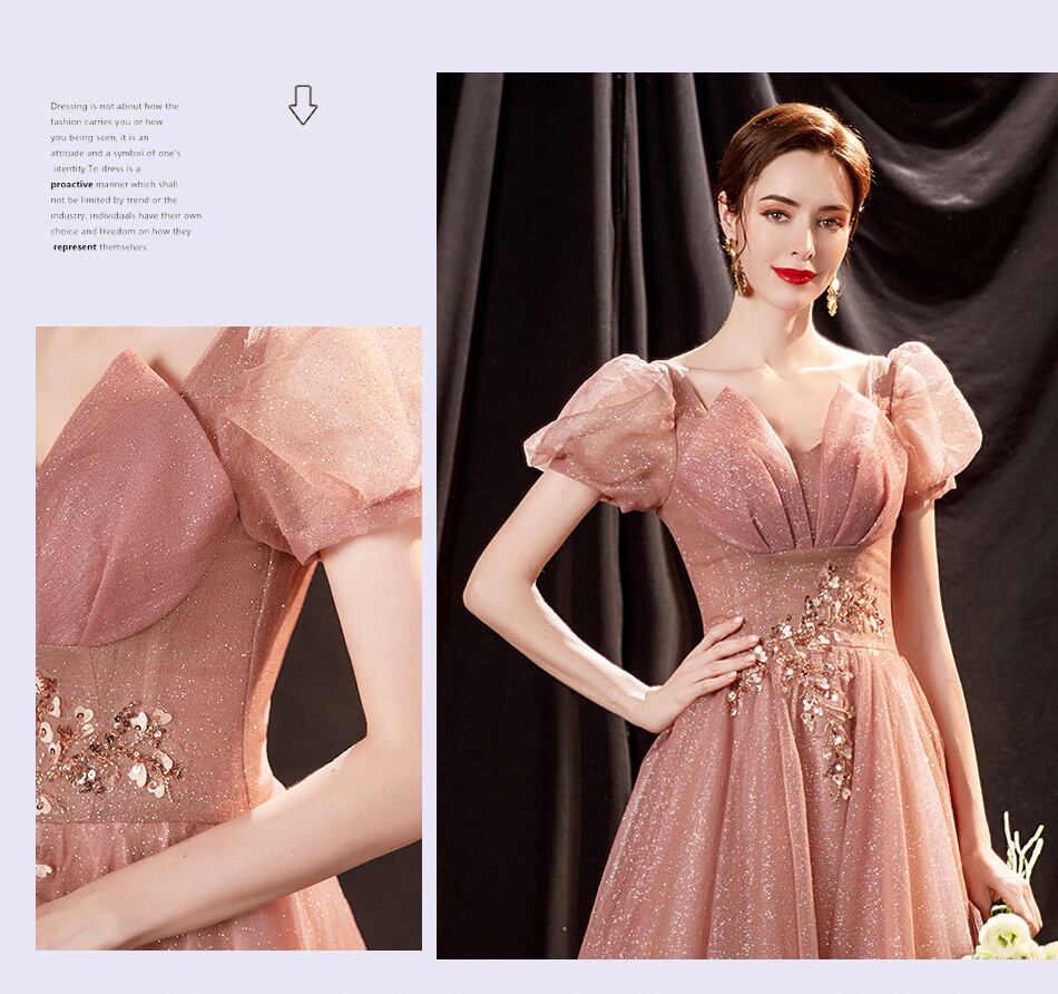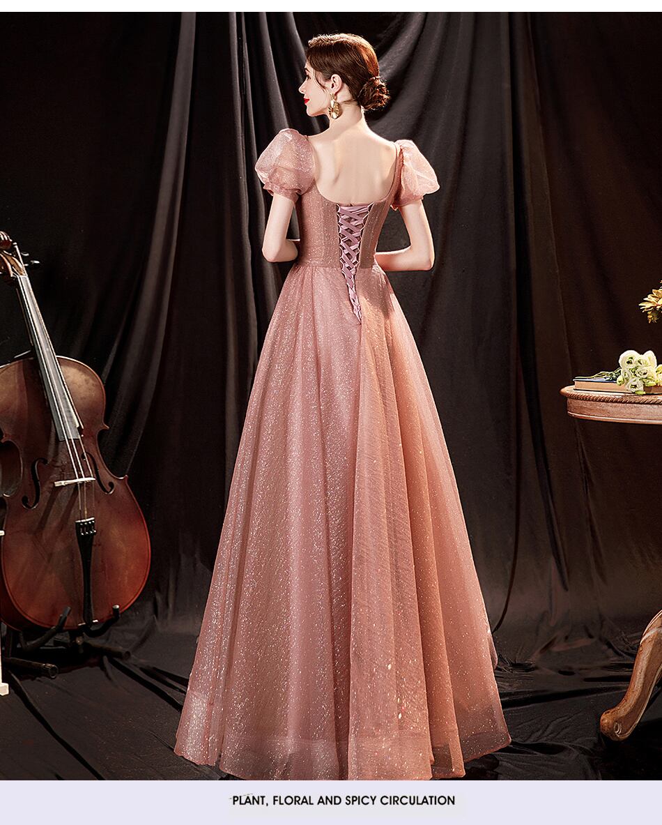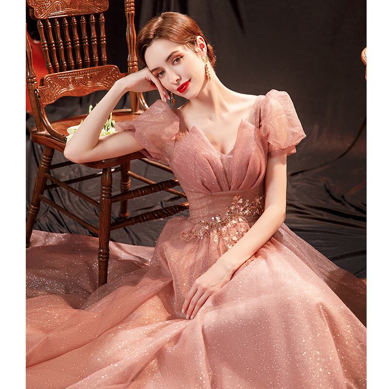 カラードレス ピンク 花嫁 拳式 演奏会/音楽会 キラキラチュール 編み上げ パフスリーブ ロング