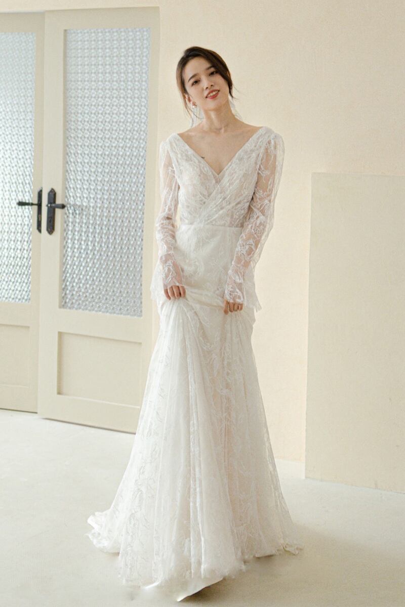 結婚式/披露宴 ウエディングドレス Vネック 花嫁 長袖 マーメイドライン 背中見せ