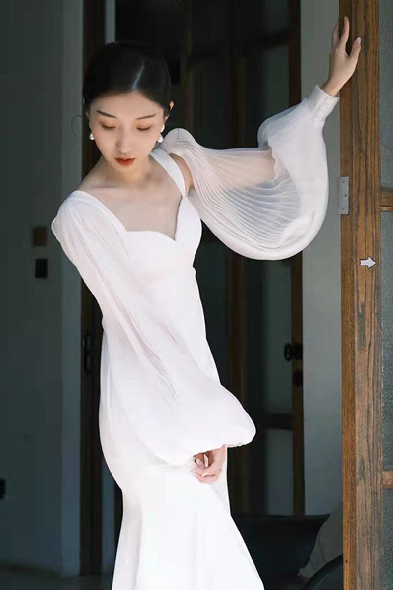 大人っぽい パーティードレス 長袖 マーメイドライン スレンダーライン 花嫁 拳式 二次会 オフホワイト
