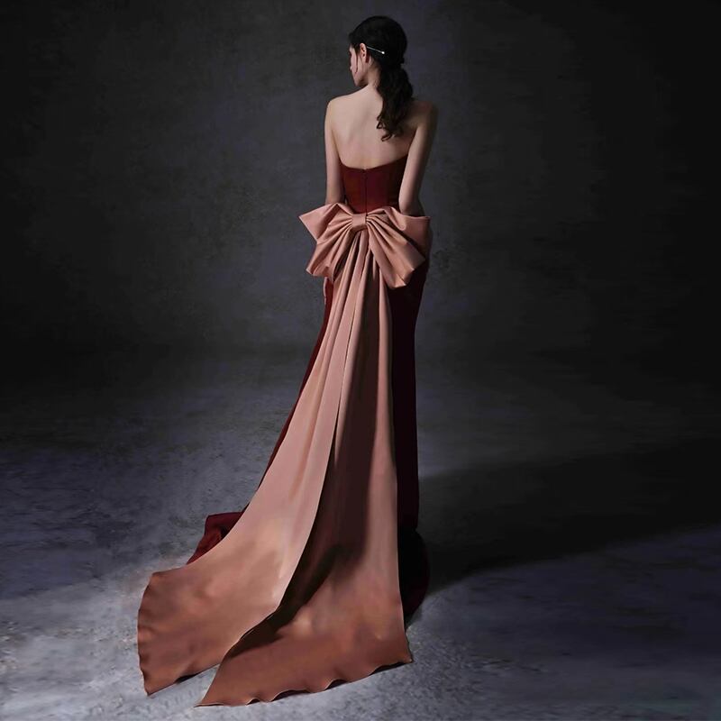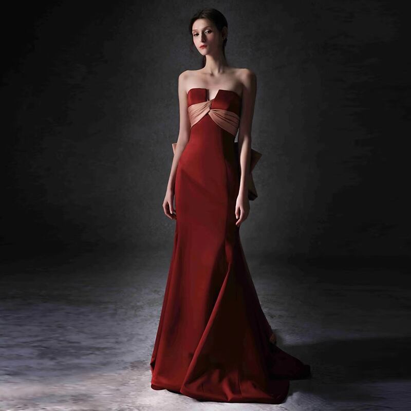 高品質! 拳式 マーメイドライン ベアトップ パーティードレス ワインレッド リボン エレガント