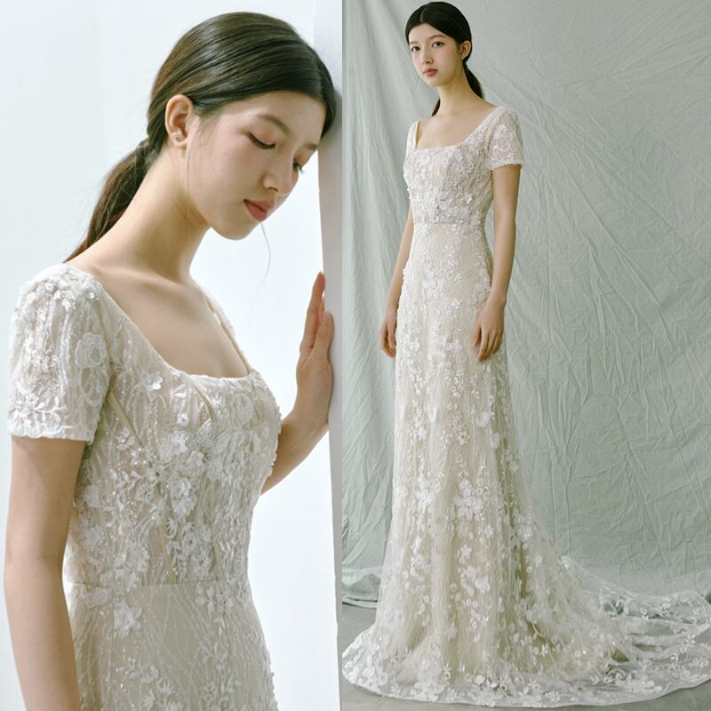 高品質! ハンドメイド ビーズ 短袖 キラキラ シアーな美しさ 花型刺绣贴 背中見せ 花嫁 拳式 マーメイドライン