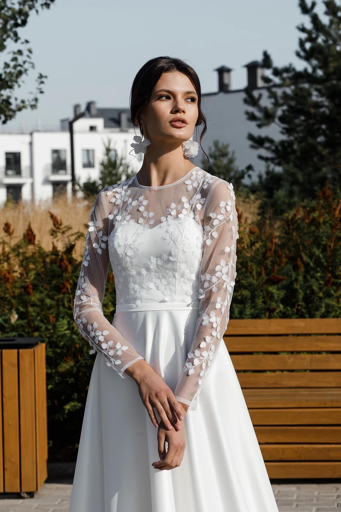 ラウンドネッ優しい パーティードレス 上品透け袖 長袖 エレガント リーフ刺繍 拳式 二次会 くるみボタン