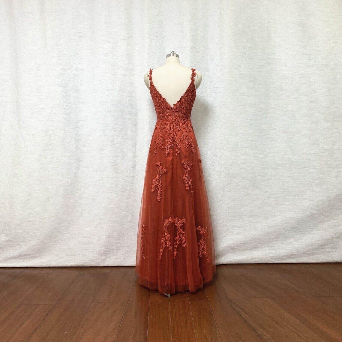 背中見せ 花嫁 テラコッタ色 パーティードレス リーフ刺繍 ファスナー 優しい ロング 拳式 音楽会 キャミソール