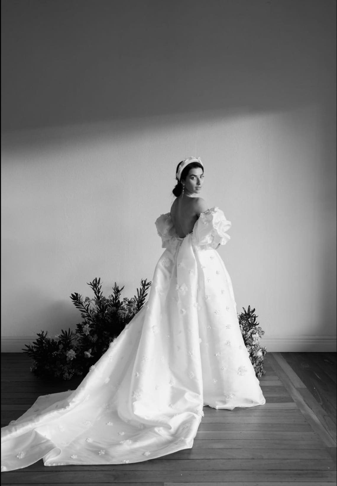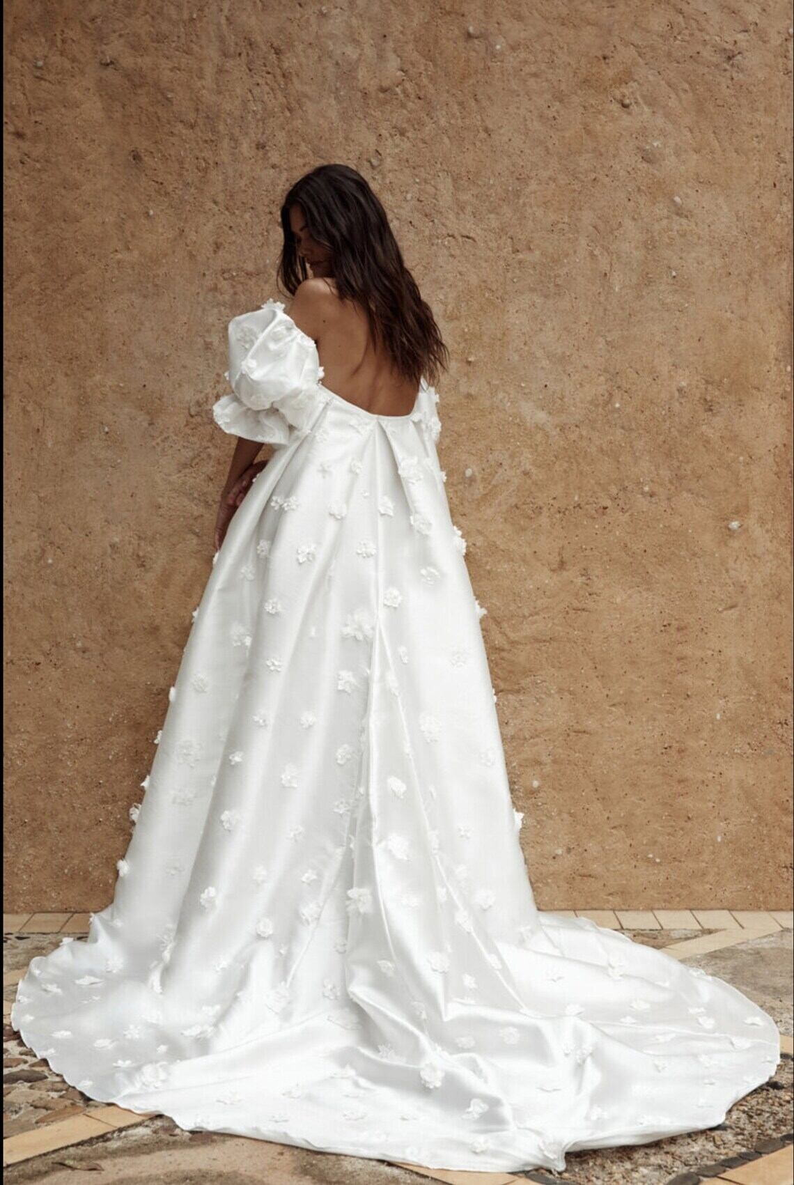 人気上昇!パーティードレス 花モチーフ ビーズ パフスリーブ 取り外し袖 花嫁妊婦 結婚式/前撮り オフホワイト