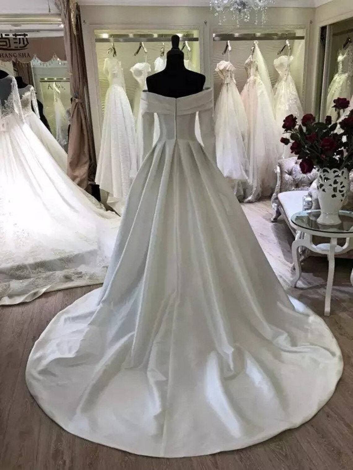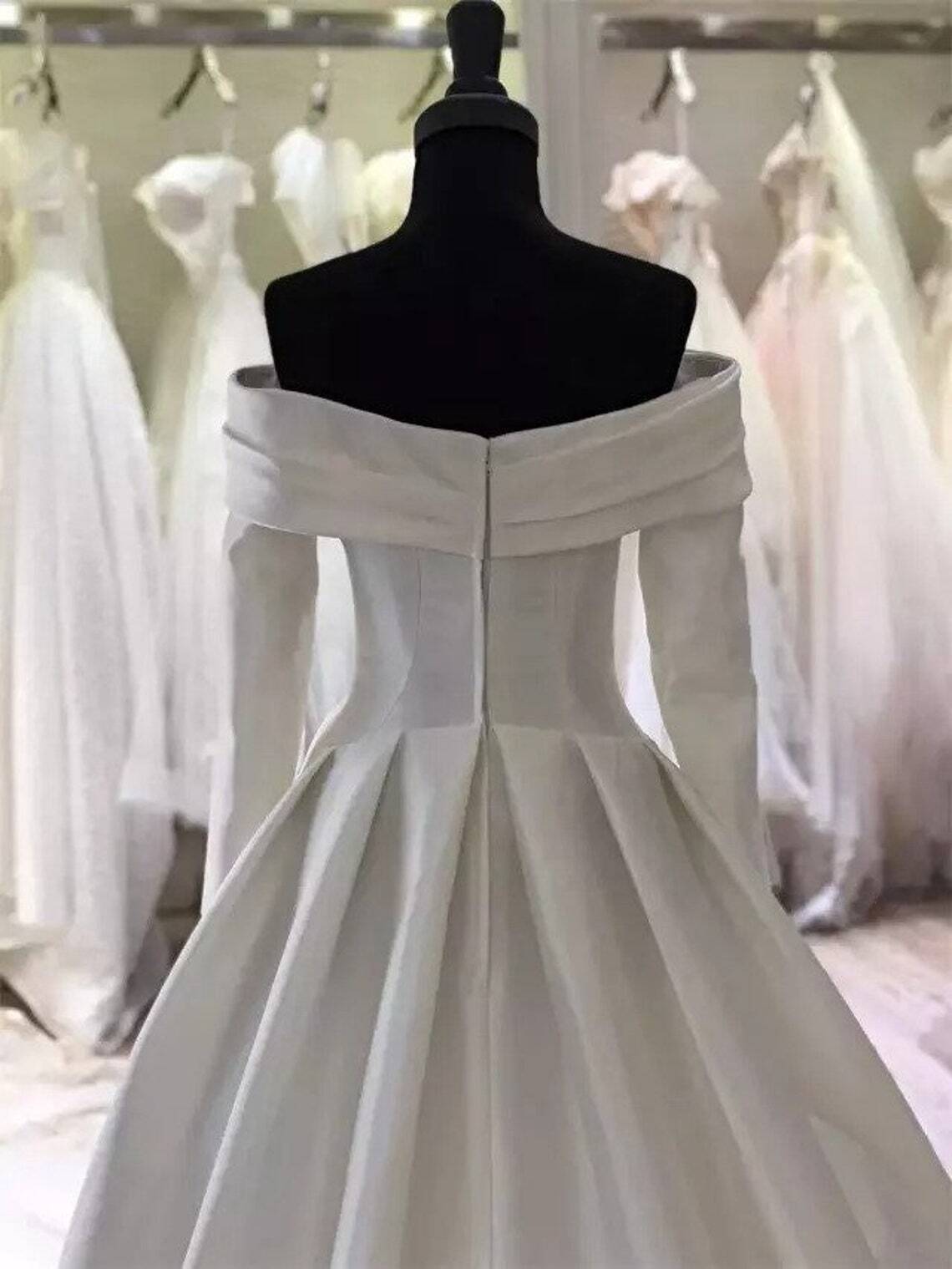 優しい オフショルダー 編み上げ サテン 長袖 Aライン オフホワイト トレーン 花嫁 拳式 結婚式