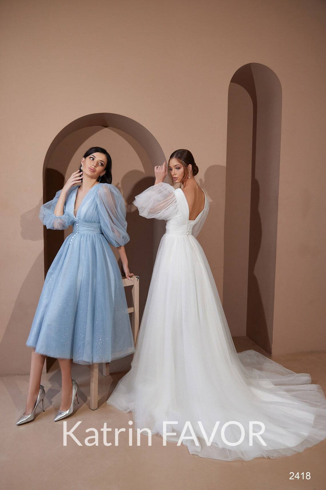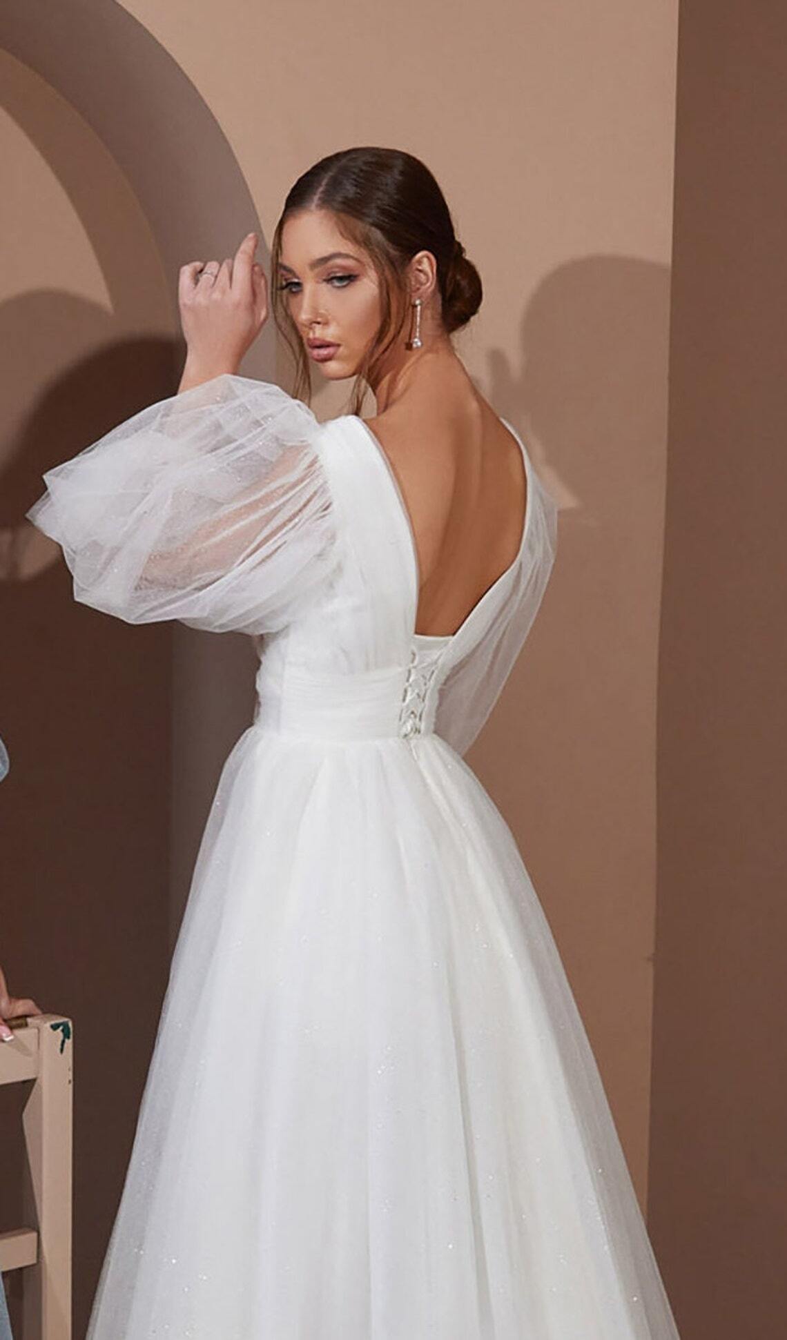 カラードレス グリーン/オフホワイト ふわふわ ランタンスリーブ Vネック キラキラチュール 花嫁 拳式