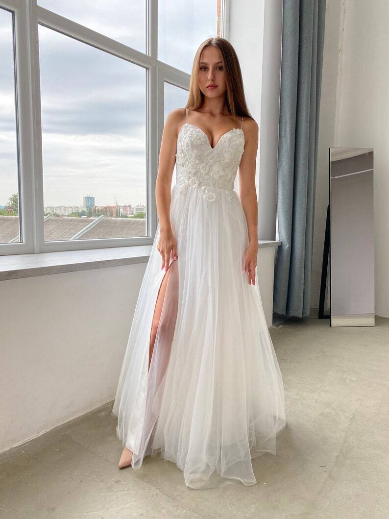 人気上昇! オフホワイト ウエディングドレス キャミソール 花モチーフ 編み上げ スリット オーダーメイド スレンダーライン 花嫁 前撮り 拳式