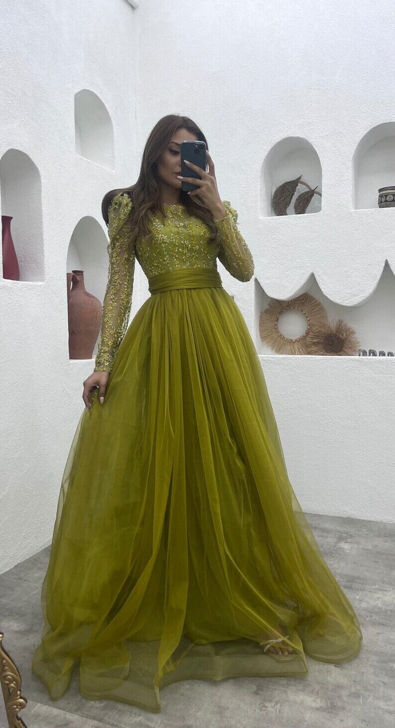 パーティードレス グリーン 長袖 ソフトチュール エレガントレース ふわふわ 花嫁 可愛い 妊婦 拳式 二次会