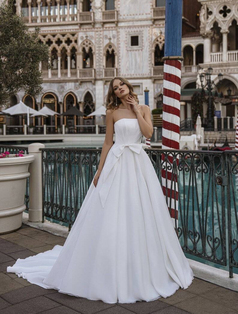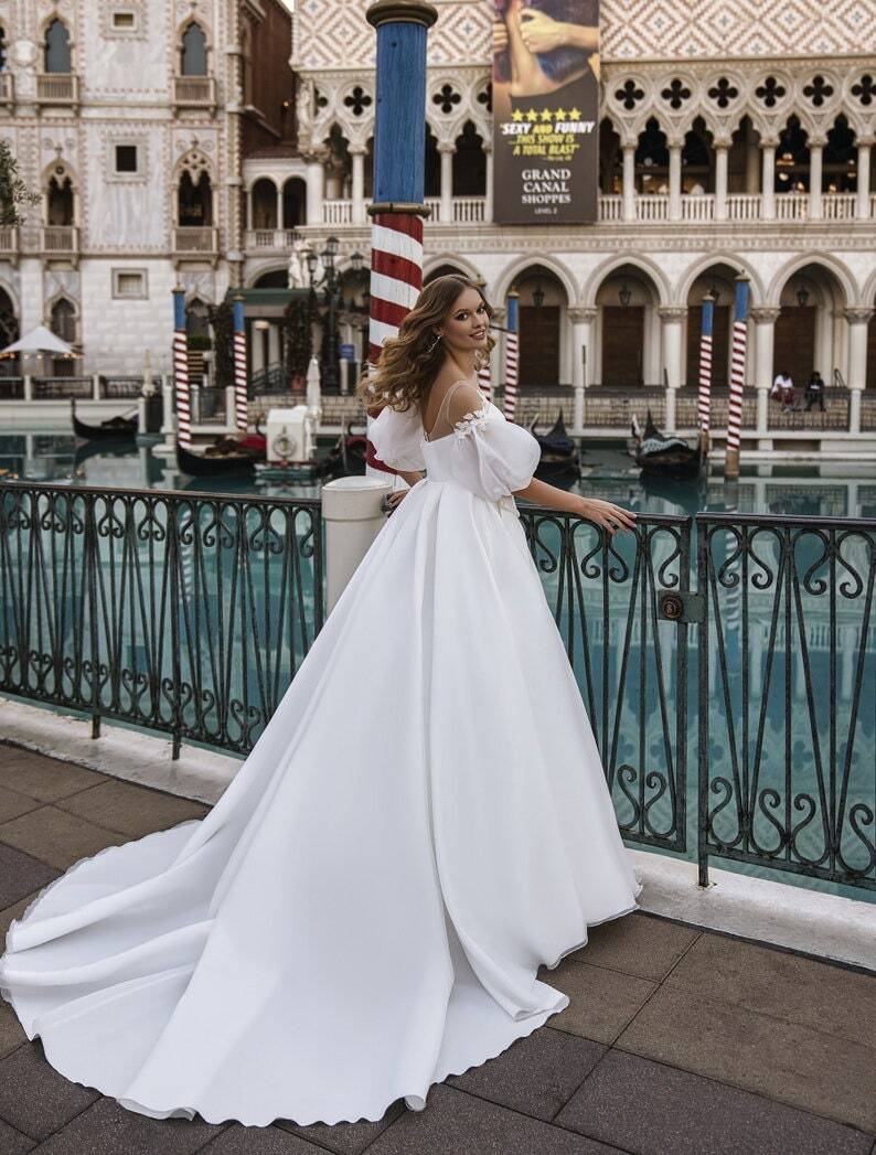 パフスリーブ 刺繍 取り外し袖 花嫁 結婚式/披露宴 リボン 揺らめく裾 ベアトップ Aライン スレンダーライン エレガント