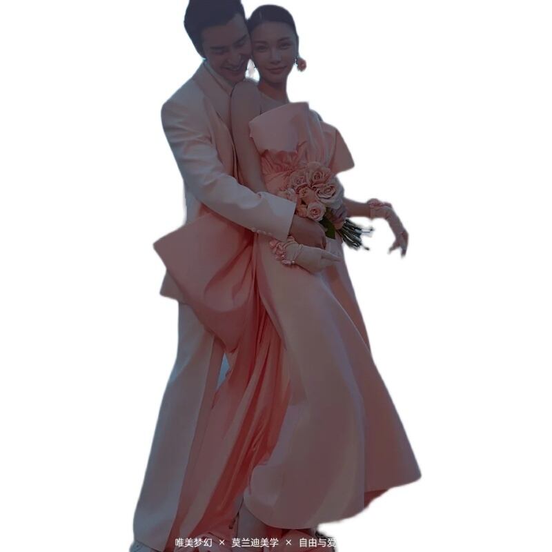 パーティードレス リボン 披露宴/前撮り くるみボタン ベアトップ 花嫁 ピンク サテン マーメイドライン スレンダーライン