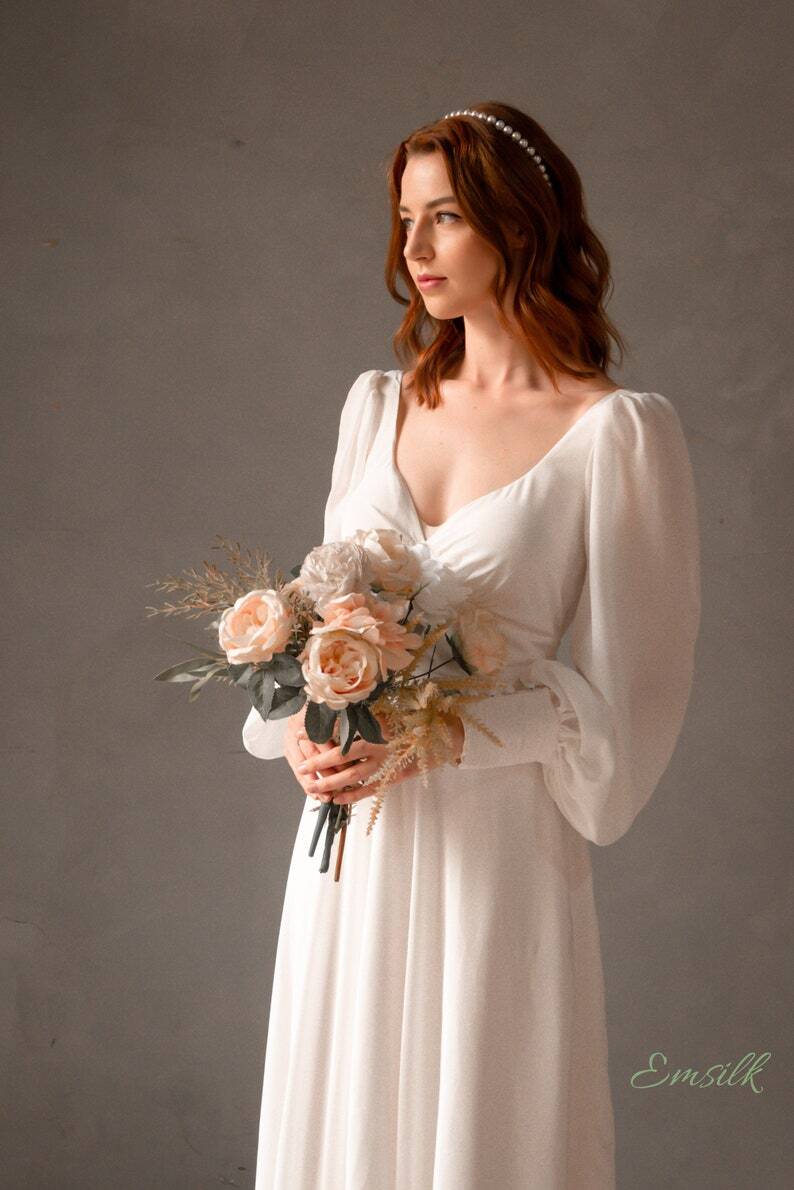 パーティードレス Vネック ランタンスリーブ リボン オフホワイト 花嫁 拳式 背中見せ 二次会 長袖 スレンダーライン