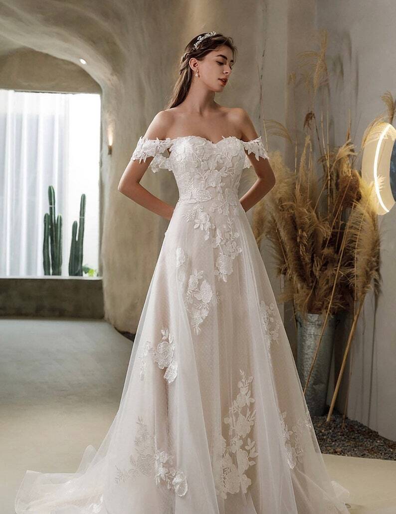 ウエディングドレス オフホワイト 花嫁 花モチーフ オフショル くるみボタン 揺らめく裾 ボタニカル柄のドレス 拳式
