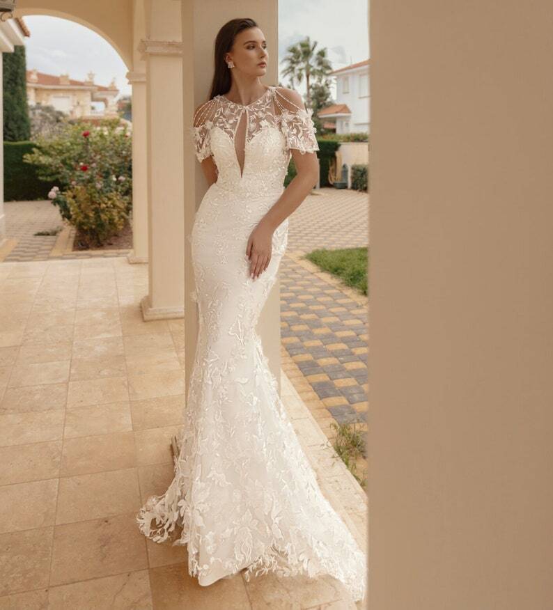 オフホワイト 可愛い 憧れのドレス ウエディングドレス 花嫁 拳式 結婚式 ラウンドネック リーフ刺繍 ポンチョ