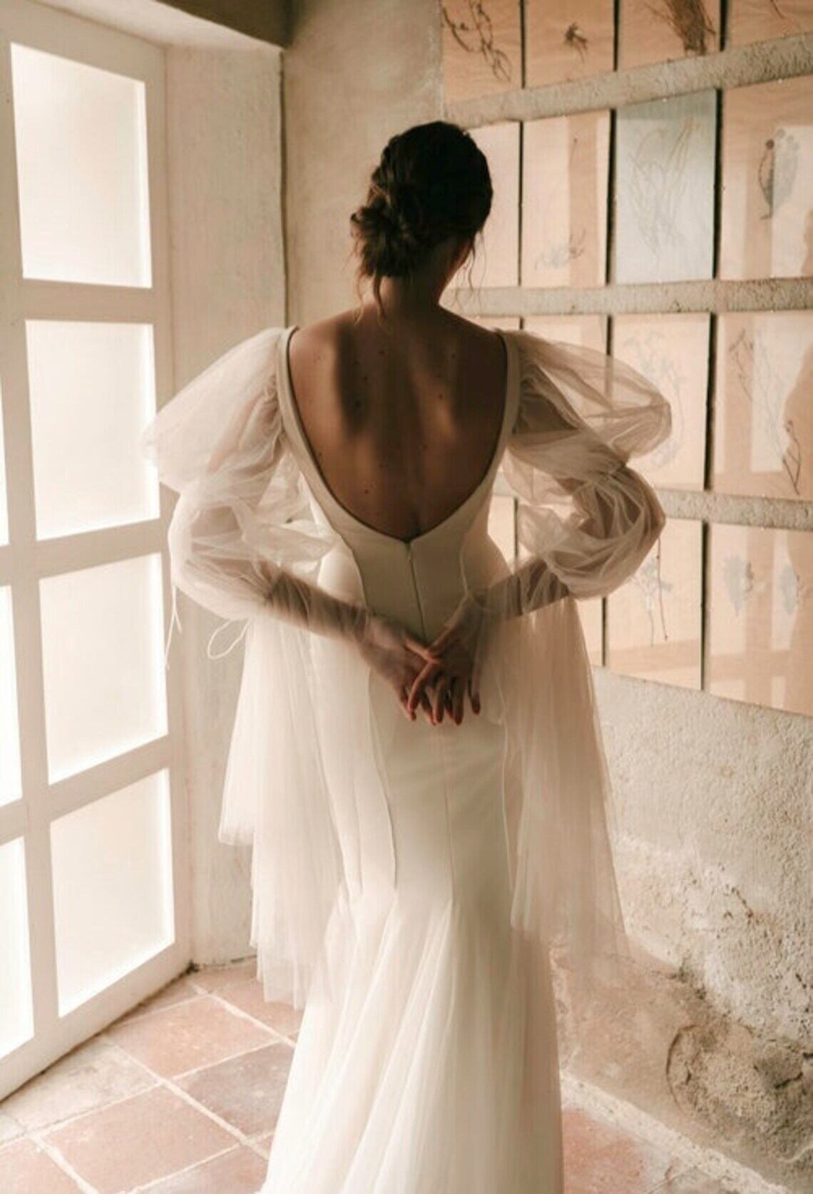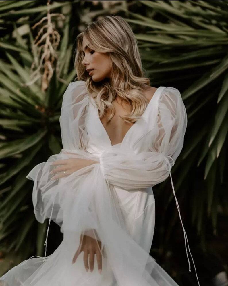 パーティードレス 長袖 マーメイドライン背中見せ 花嫁 拳式 Vネックドレス 取り外し袖 色直し デザイン感オフホワイト