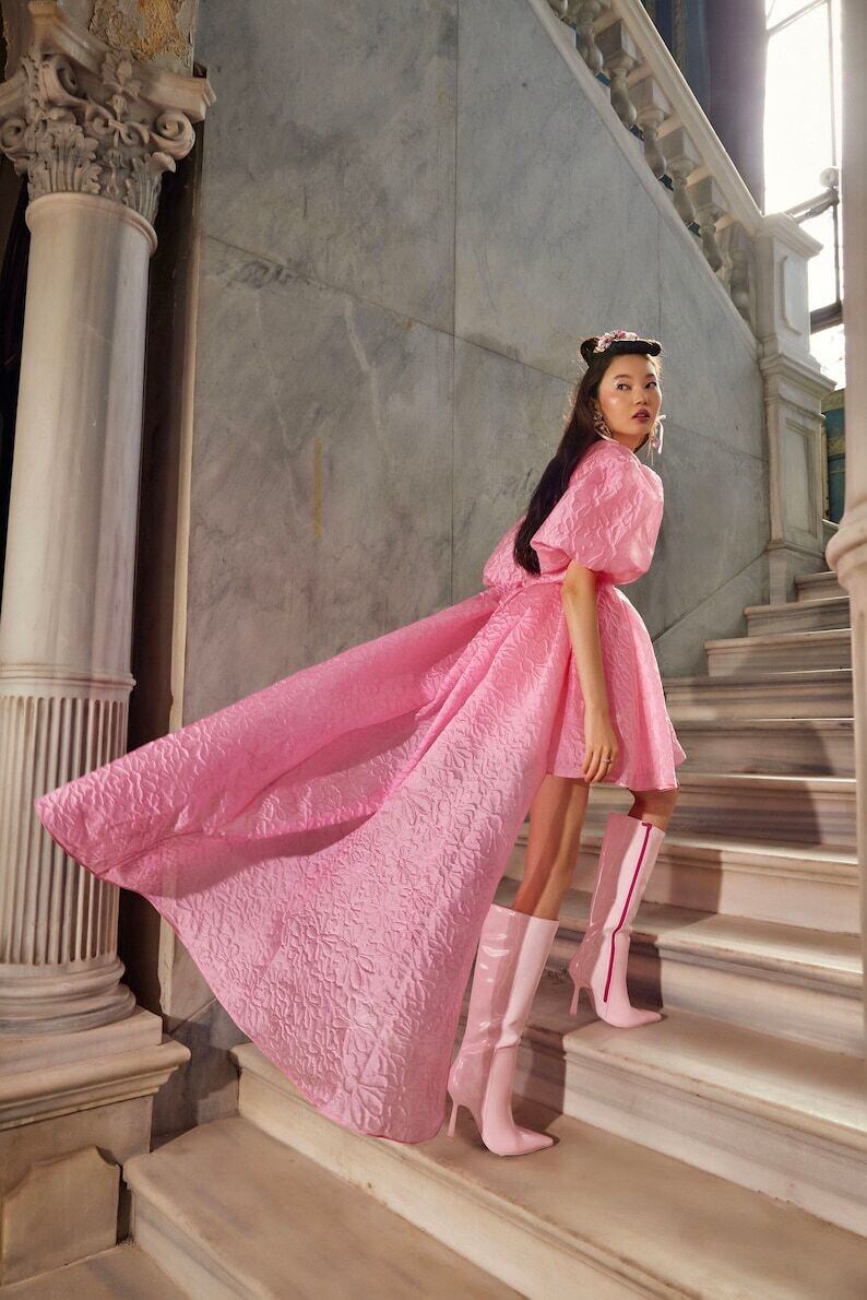 ミニドレスデザイン感 パーティードレス ピンク パフスリーブ ポンチョ 花嫁 前撮り/結婚式 スレンダーライン