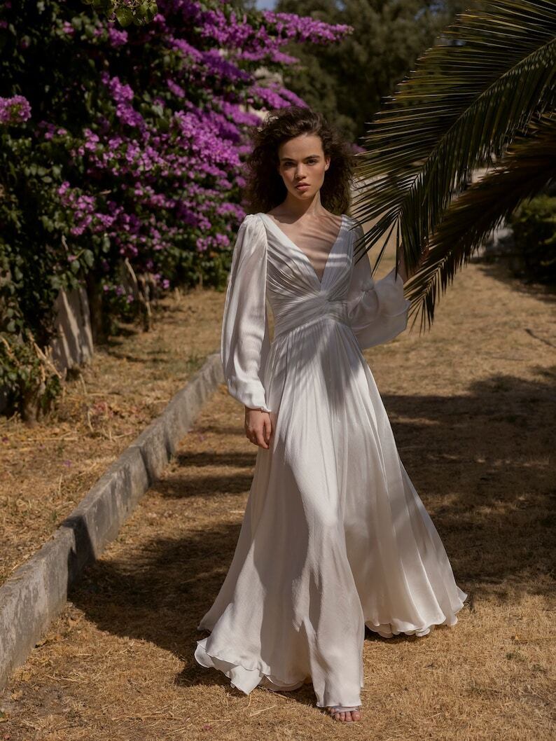 細見えシルエット パーティードレス Vネックドレス 長袖 快適な生地 リボン 花嫁 拳式 前撮りふわふわ袖 滑らか