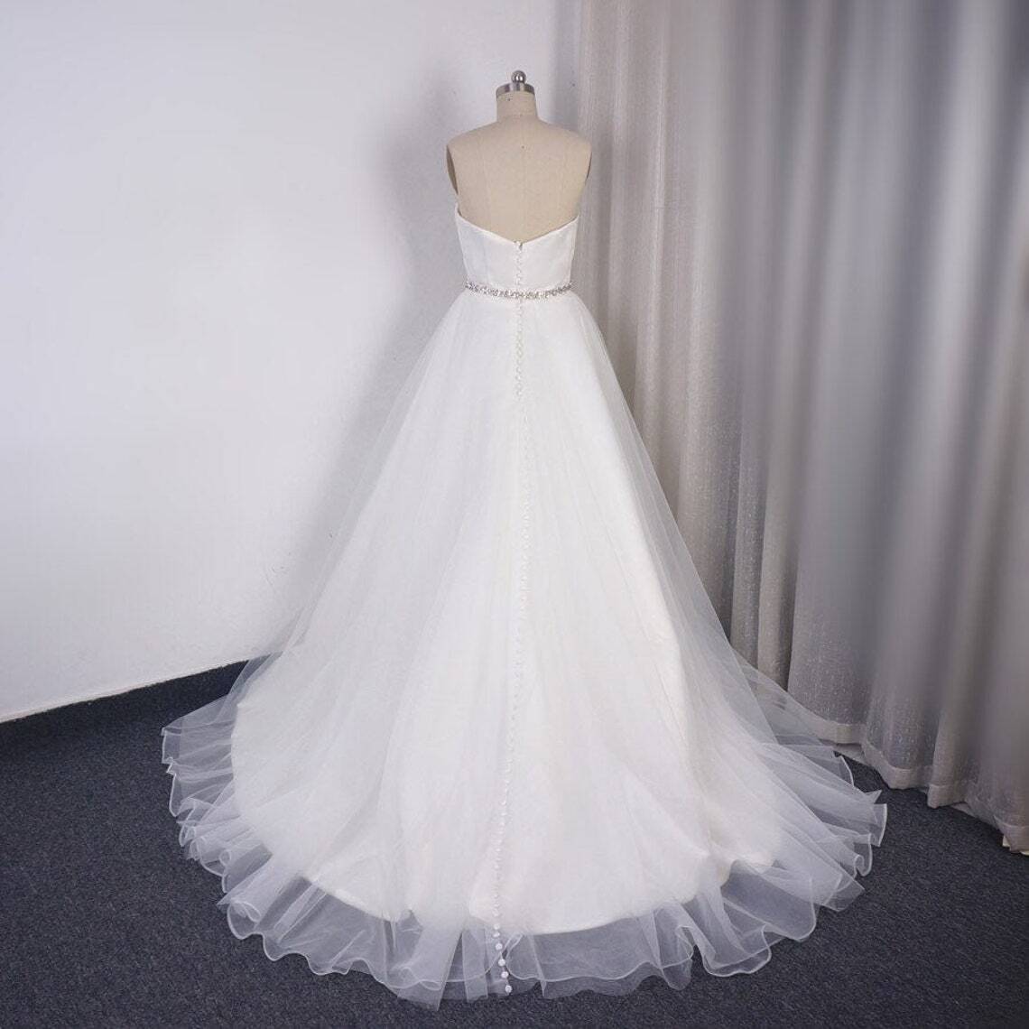 くるみボタン ウエディングドレス オフホワイト ベアトップ ベルト チュールスカート ビジュー 花嫁 拳式 前撮り