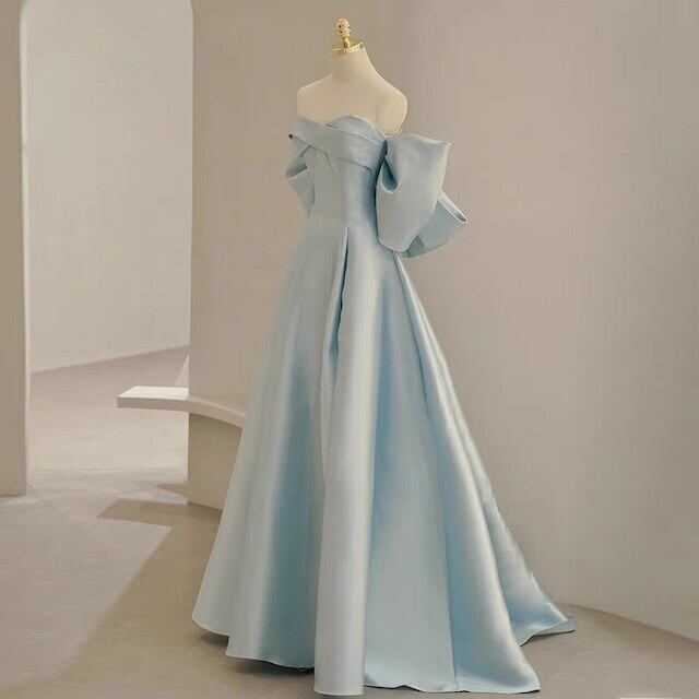 パーティードレス リボン 水色 取り外し ベアトップ 演奏会/音楽会 Aライン 光沢サテン 憧れのドレス