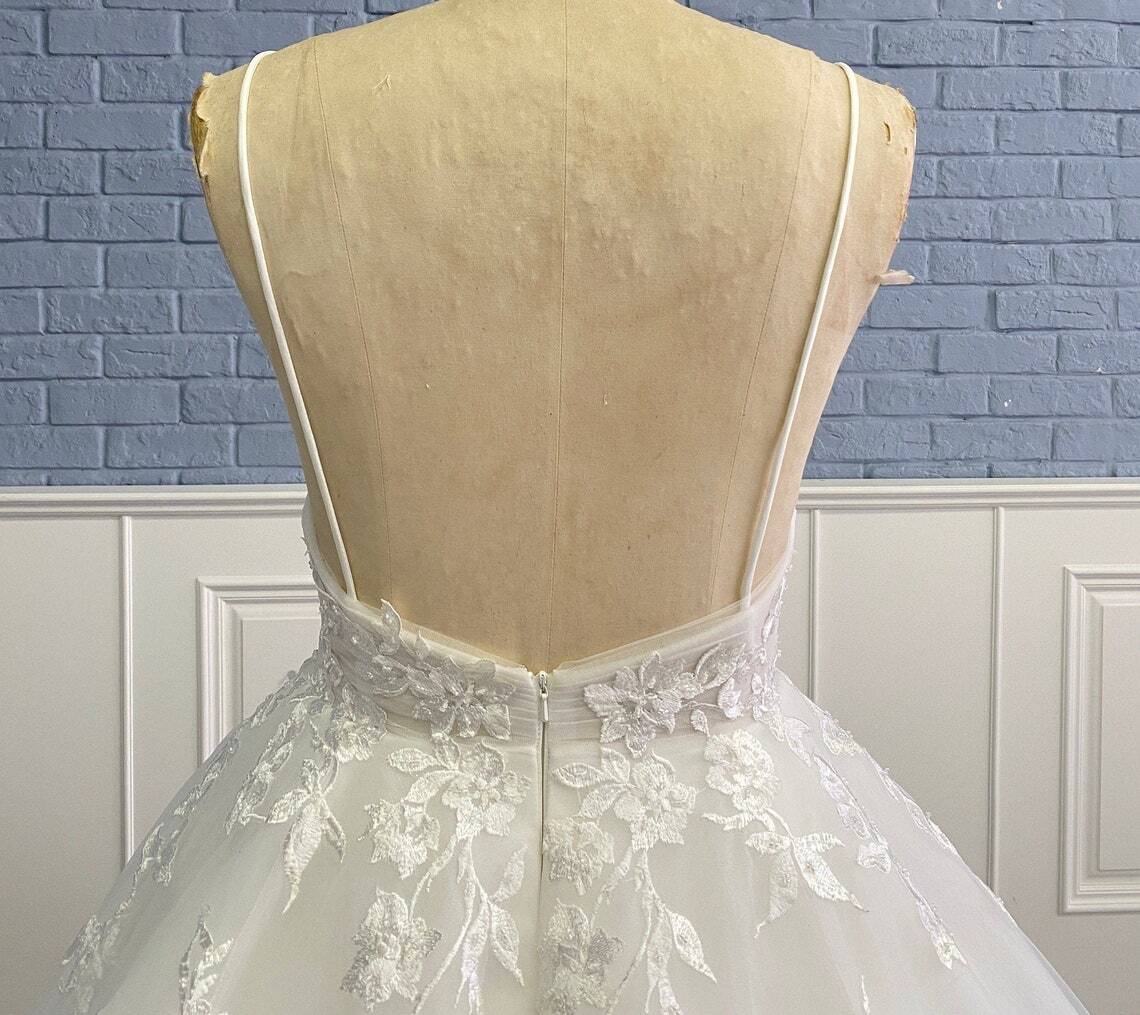 ウエディングドレオフホワイトキャミソール Vネック 背中見せ プリンセスライン 花モチーフ背中見せ 拳式 二次会