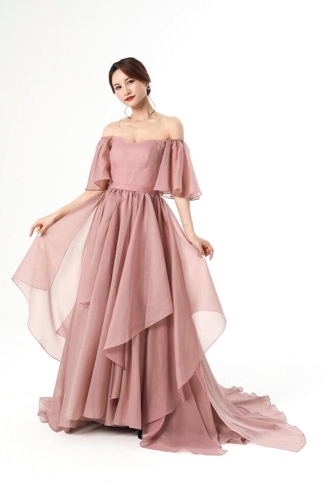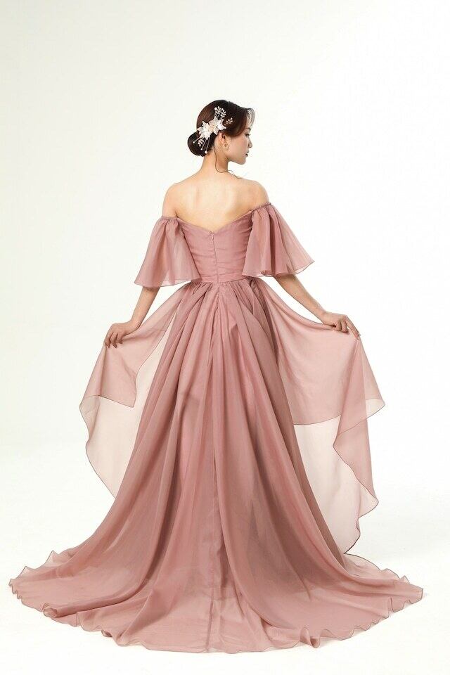 優しい パーティードレス フレアスカート オフショルダー ピンク アシメドレス 拳式 前撮り ふんわりシフォン フリル袖
