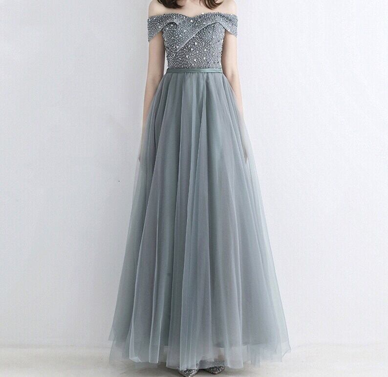 夜会服 細見えシルエット 揺らめく裾 編み上げ 演奏会/音楽会 ブルーグレー オフショルダー ビジュードレス