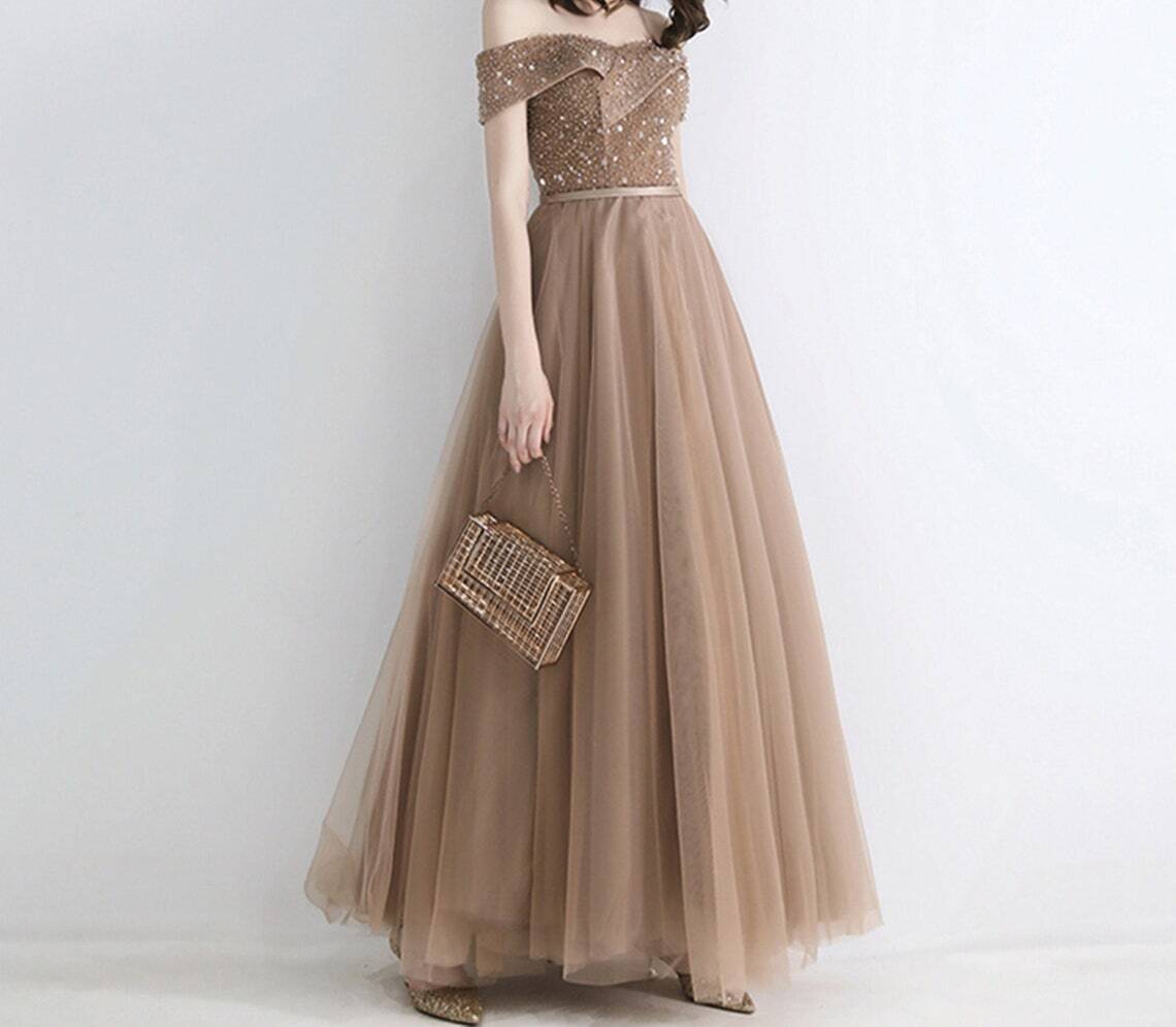 夜会服 細見えシルエット 揺らめく裾 編み上げ 演奏会/音楽会 :シャンパン色 オフショルダー ビジュードレス