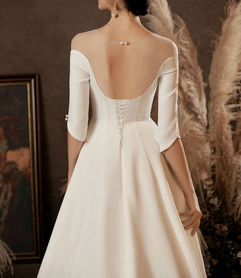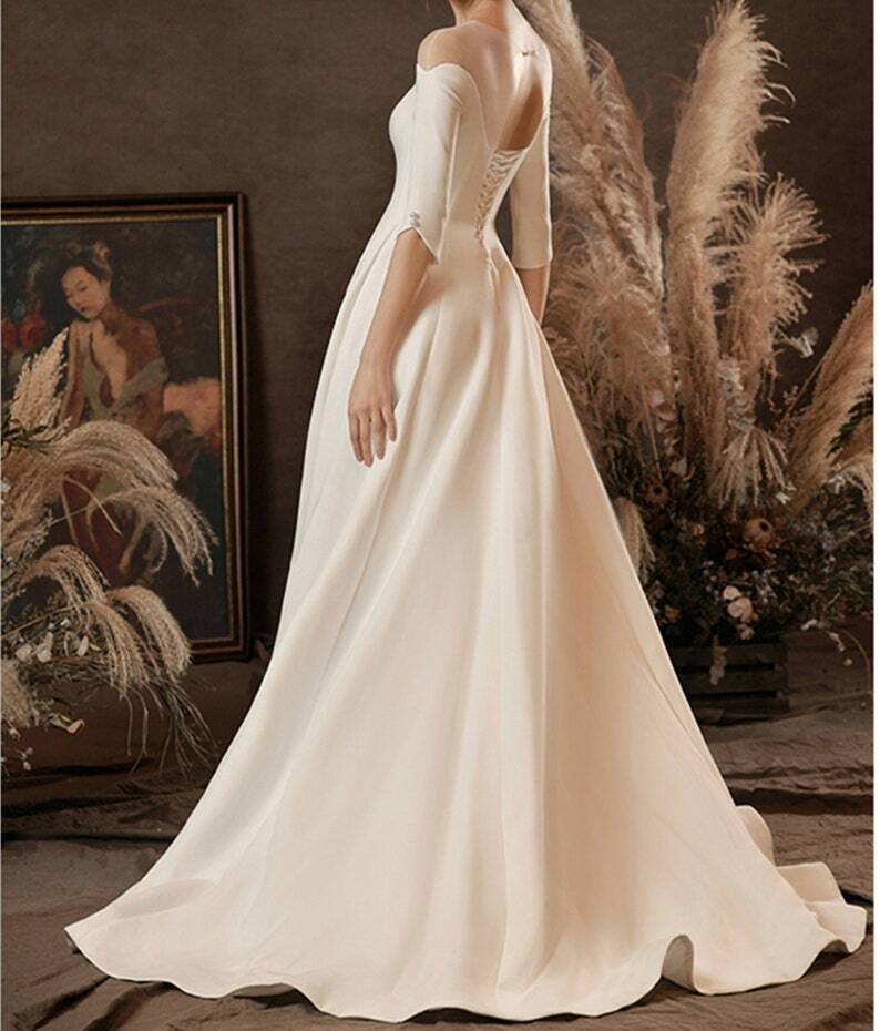 パーティードレス 長袖 編み上げ オフホワイト 編み上げ 花嫁 披露宴/結婚式 背中見せ 細見えシルエット