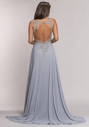 クラシカル ブルーグレー 夜会服 パーティードレス 背中見せ 花嫁 拳式 キラキラ ラウンドネック ノースリーブ