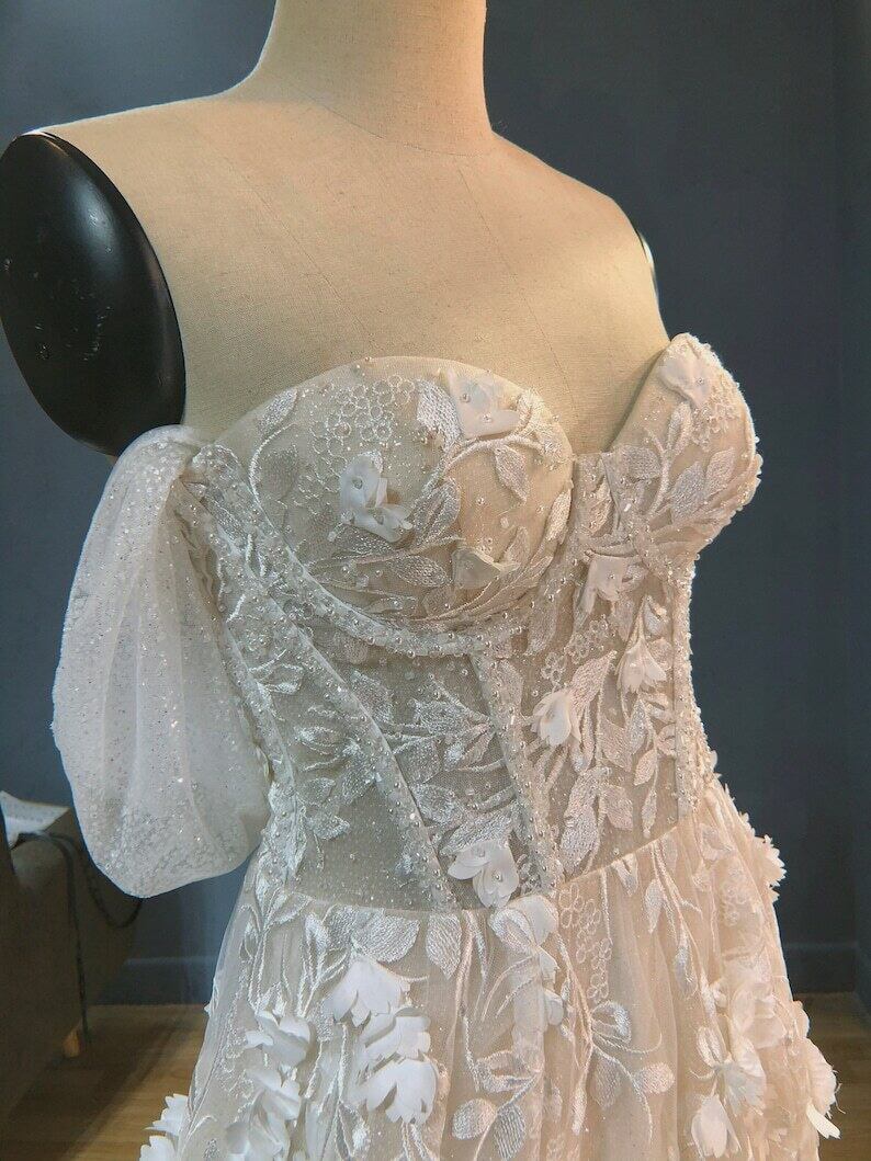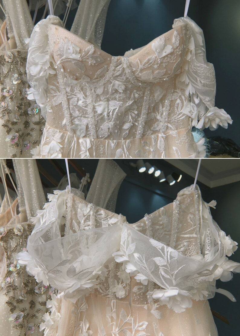 オフショルダー ベアトップ パーティードレス 細見えシルエット 披露宴/結婚式 花嫁 繊細レース 枝花刺繍 可愛い