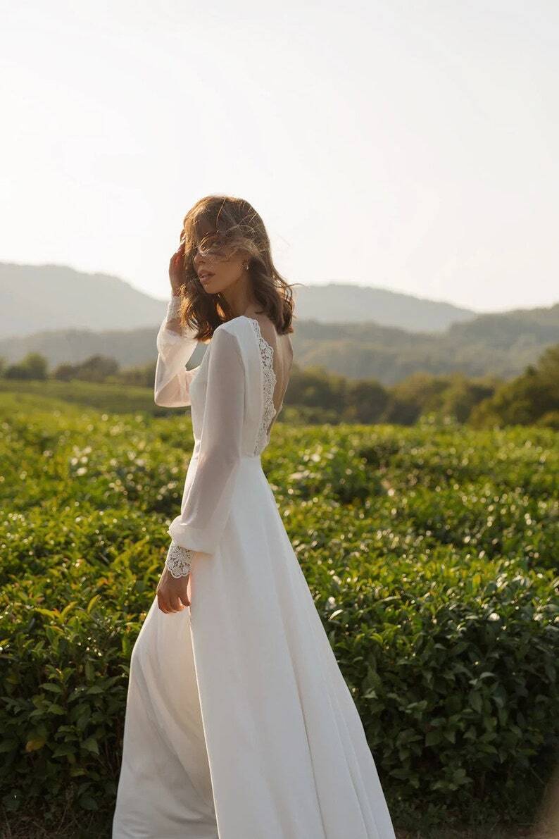 オフホワイト パーティードレス 細見えシルエット拳式 結婚式 花嫁 繊細レース 枝花刺繍 長袖 優しい 背中見せ