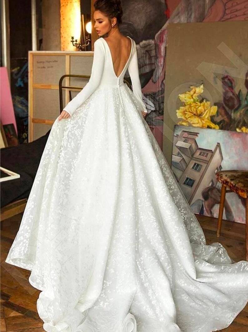 パーティードレス憧れのドレス 繊細レース 背中見せ 花嫁 結婚式 エレガント 長袖くるみボタン Vネック オフホワイト