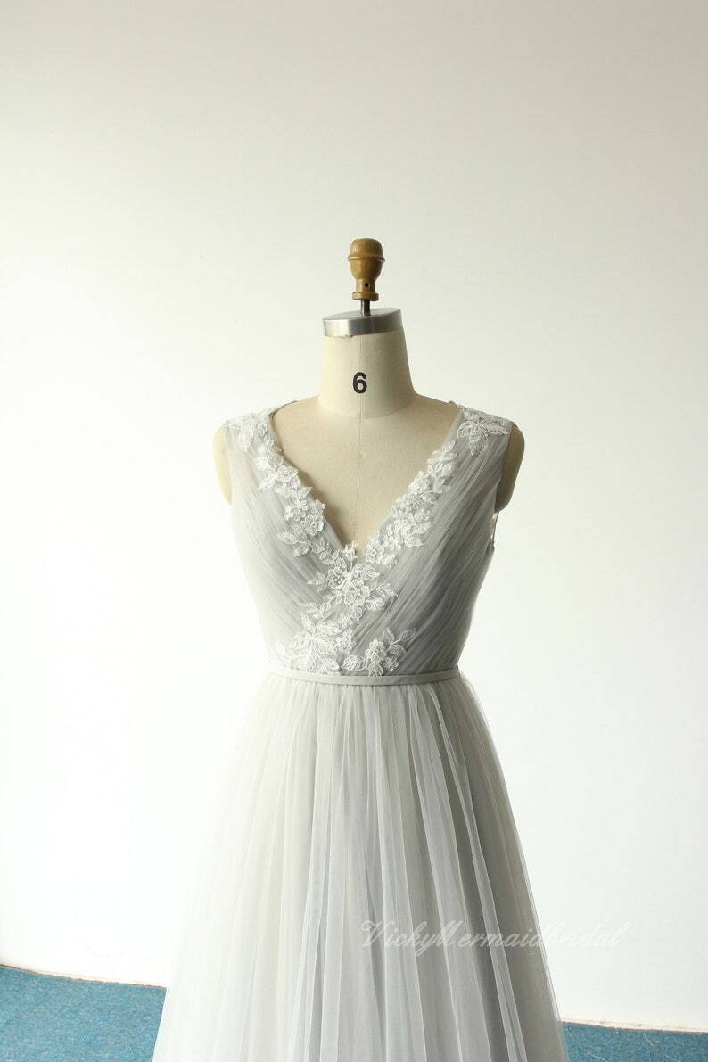 パーティードレス リーフ刺繍 Vネックドレス シルバーグレ くるみボタン ソフトチュール 花嫁 披露宴/結婚式