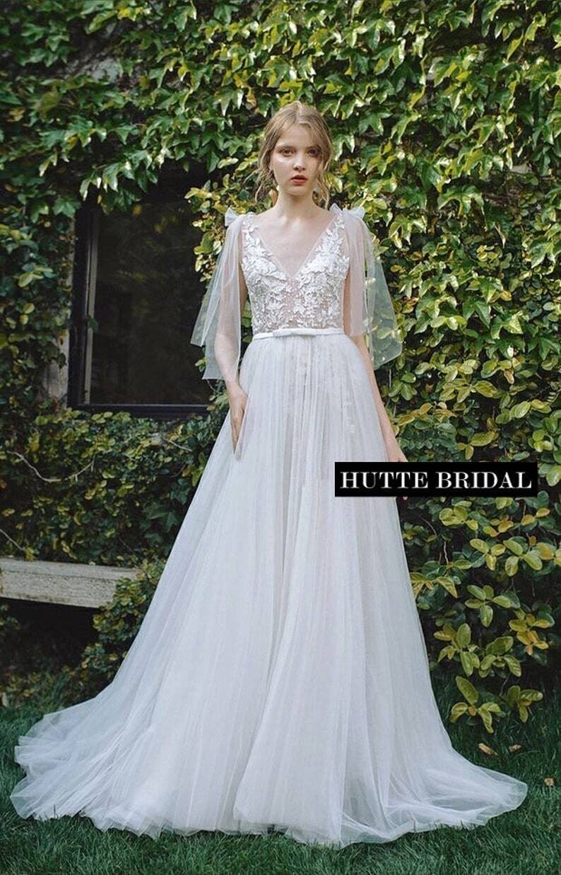 フリル袖 Vネック 刺繍 繊細レース ビジュードレス 背中見せ 花嫁 チュールスカート エアリー感 拳式 オフホワイト