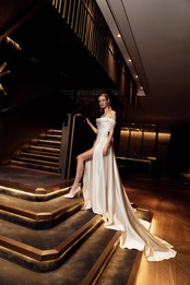 パーティードレス ケープ風ドレス 滑らか オフショルダー オフホワイト トレーン 花嫁 お呼ばれ/二次会
