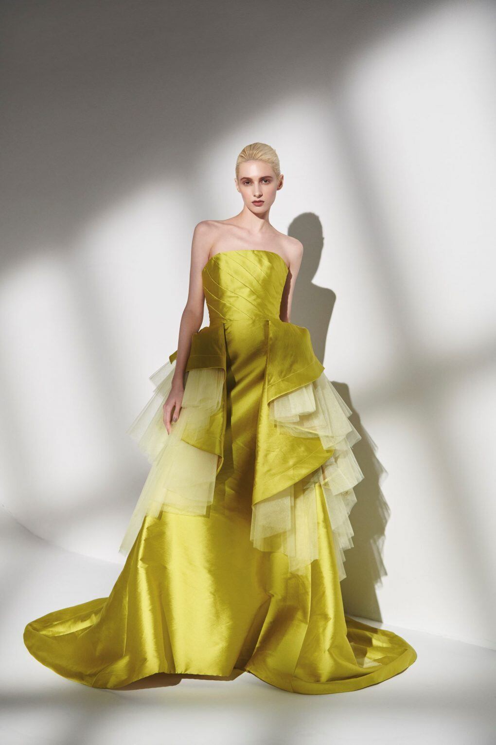 パーティードレス 黄色い ベアトップ プリーツドレス 華やか お呼ばれ/パーティー/デート